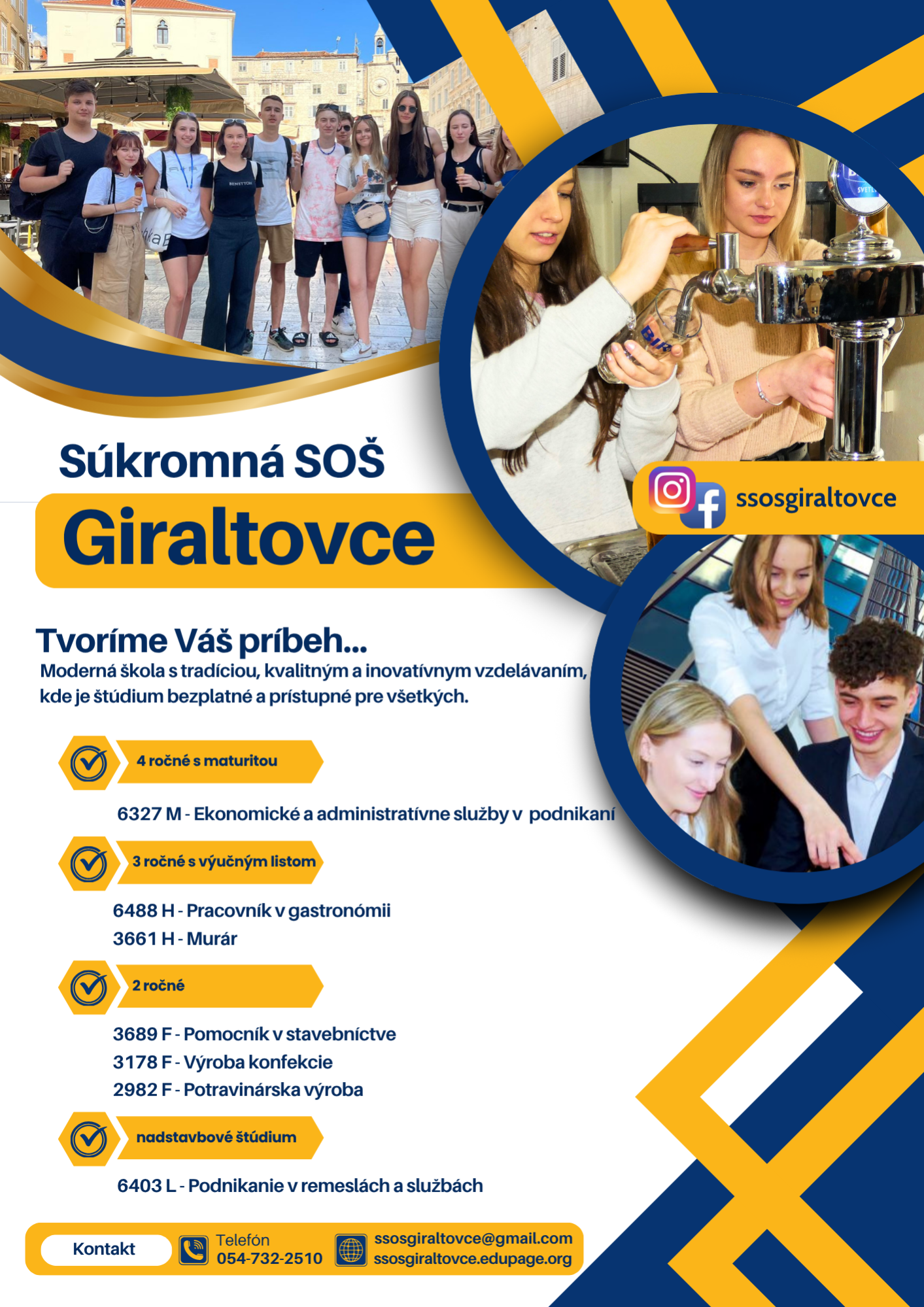 Naša škola sa už po šiesty krát stala úspešným žiadateľom o podporu z programu Erasmus+, tentokrát s názvom Pripravujeme sa praxou v Španielsku. Vďaka získanému finančnému príspevku majú žiaci kompletne celý pobyt (doprava, ubytovanie , strava, ...) hradený z grantov Európskej únie na podporu aktivít v oblasti vzdelávania, odbornej prípravy, mládeže a športu.